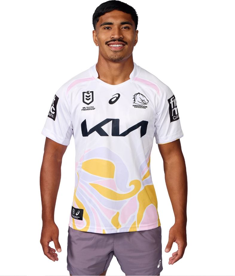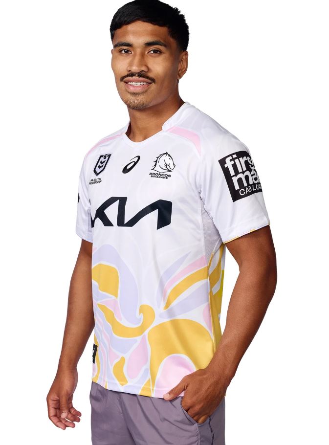 To celebrate International Women's Day, The Broncos have partnered with popular Brisbane based fashion brand SABO to create the 2025 BRISBANE BRONCOS REPLICA ALTERNATE JERSEY. A new ergonomically designed vee neckline and collar stand update with continued mesh gusset panelling provide added comfort and a touch of tradition. Produced using a durable and lightweight 100% recycled polyester performance fabric."