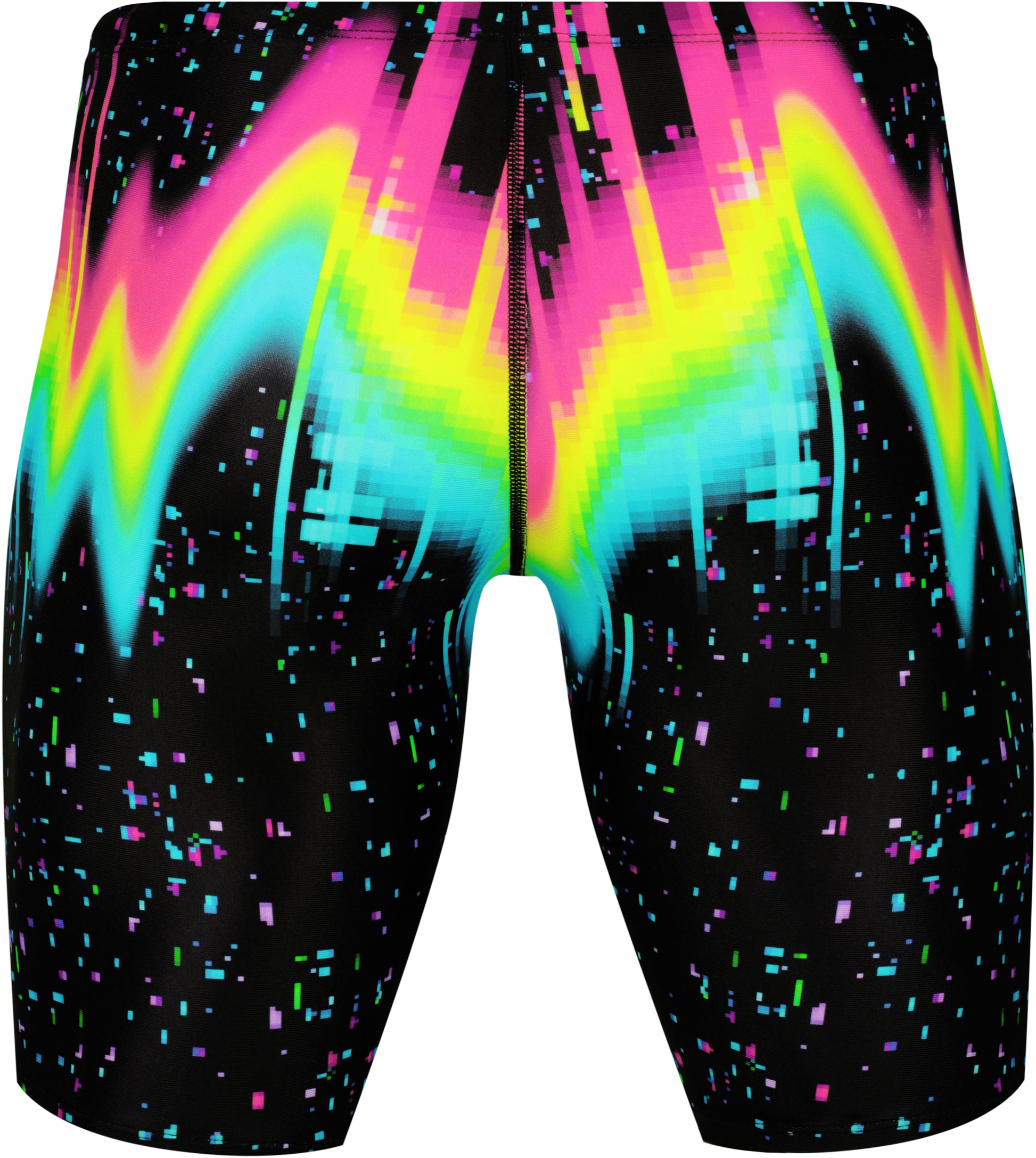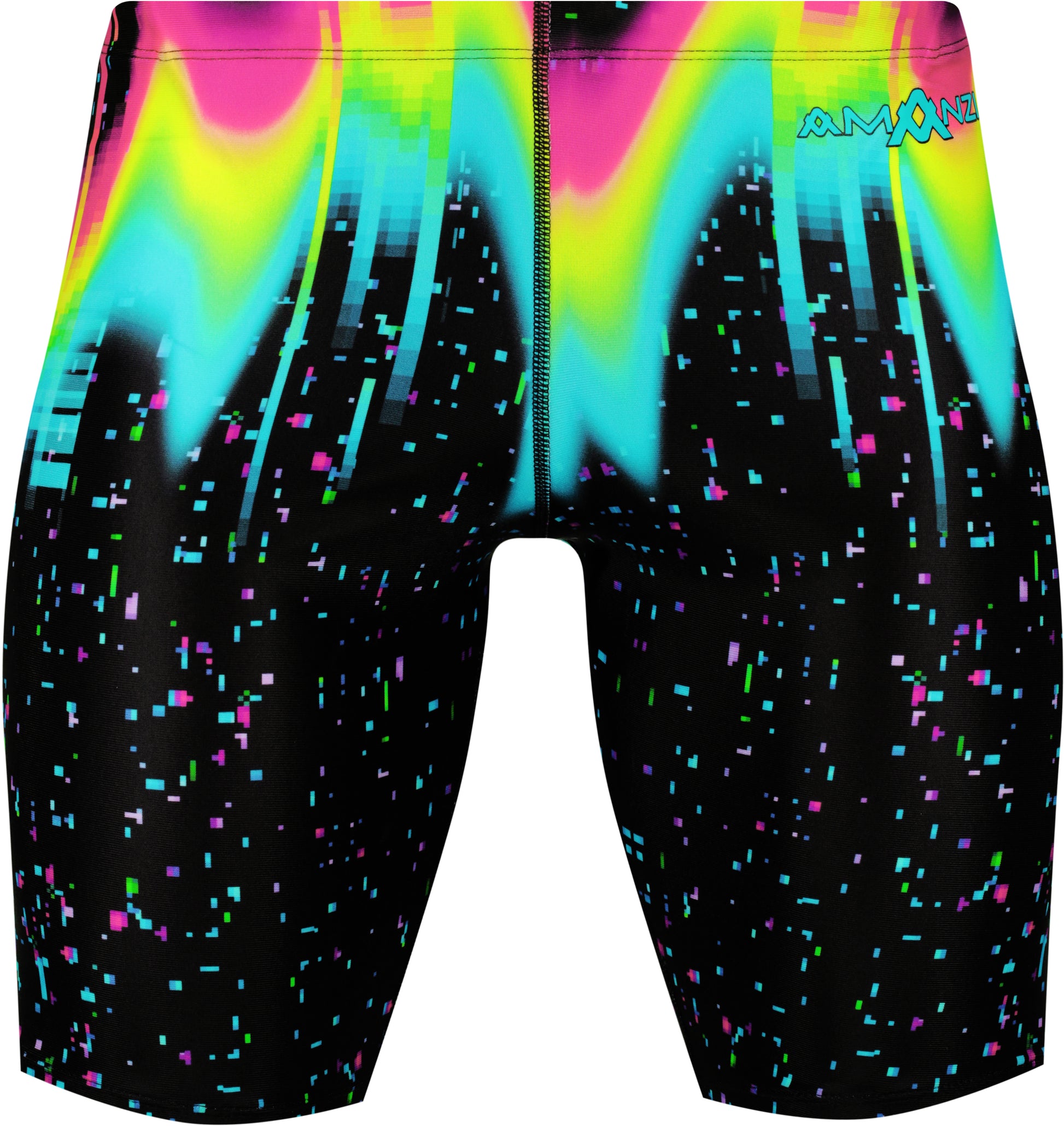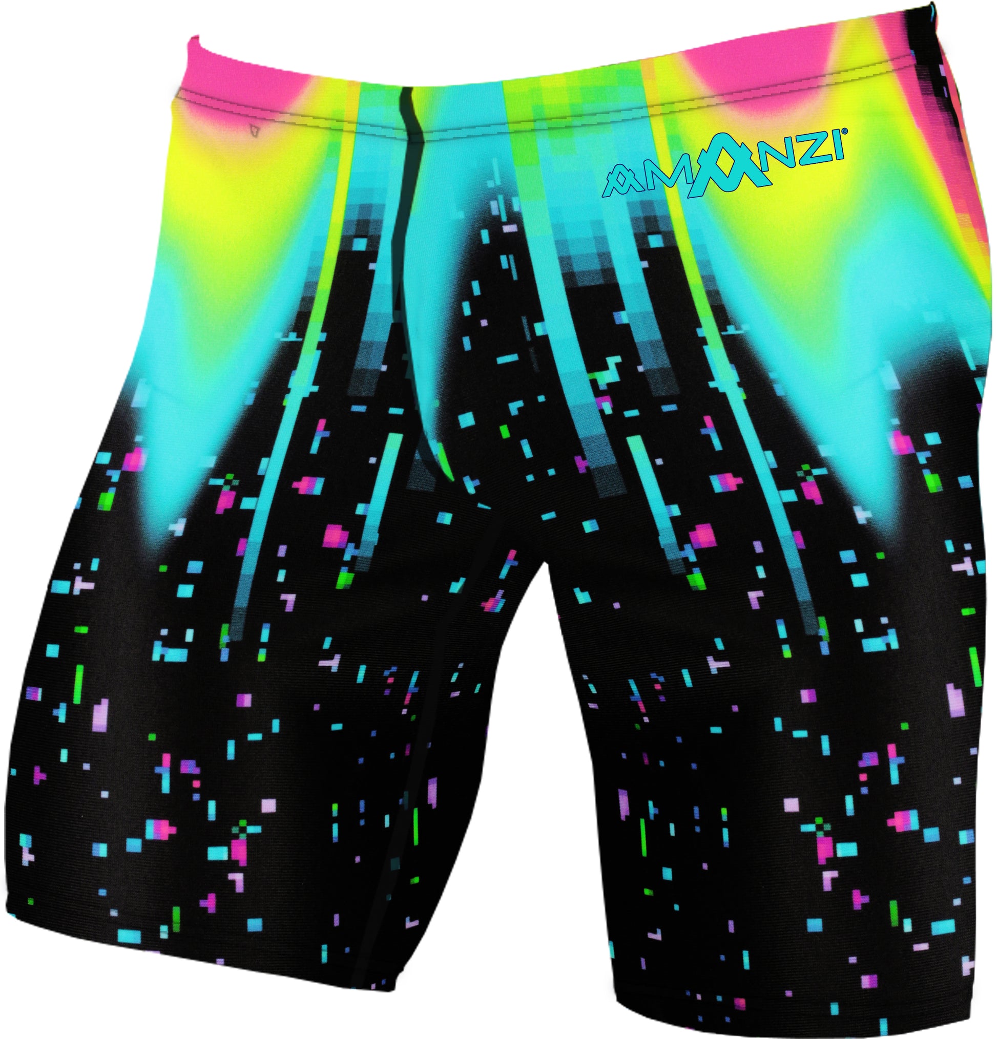 The AMANZI Sonic Burst Jammers feature a striking print that combines a jet-black background with vibrant bursts of colour. Multi-coloured space flecks create a mesmerizing effect, while neon pink, yellow, and aqua zig-zag light beams add a jolt of energy and excitement. The overall effect is both dramatic and futuristic, making this print ideal for those looking to make a bold statement. With its electrifying combination of colour and energy, Sonic Burst is sure to turn heads and capture attention.