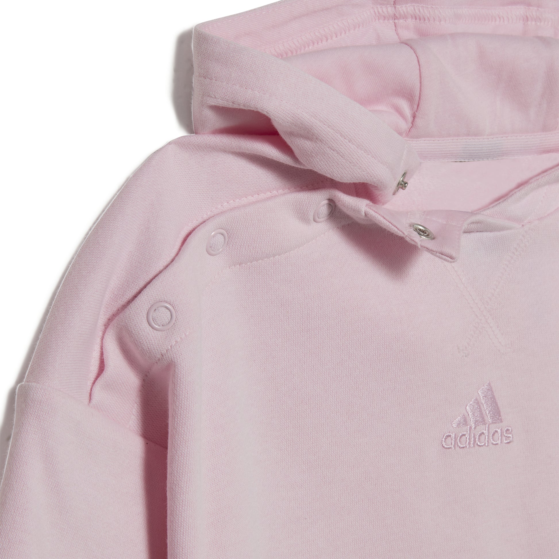 Get your little one's day off to a comfy start in this infants' adidas track suit. The stretchy legs have a snug fit that stays on no matter how far they crawl. A hooded top with snaps on the shoulder helps you get them dressed and out the door in record time.